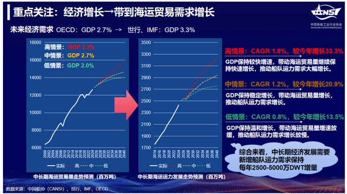 全球经济复苏的步伐虽然缓慢,但展现出了韧性。2024年四季度以来,国际货币基金组织(IMF)、经济合作与发展组织(OECD)、联合国贸易和发展会议(UNCTAD)等国际组织对2025年世界经济发展已经给出了判断,普遍预测全球经济增长将在2.7%~3.3%的区间,持平或好于2024年初的预测。美联储降息周期带动全球货币政策转向宽松进而提振贸易,构成需求侧的正向支撑。根据中国船协的情景模型测算,中长期经济增长发展需要新增运力保持在年均2500万-5000万DWT,仍然是支撑新造船市场稳定的重要因素之一。全球普遍进入降息周期的背景下,经济的温和复苏将会带动海运贸易规模增长并持续带动运力的新增需求。