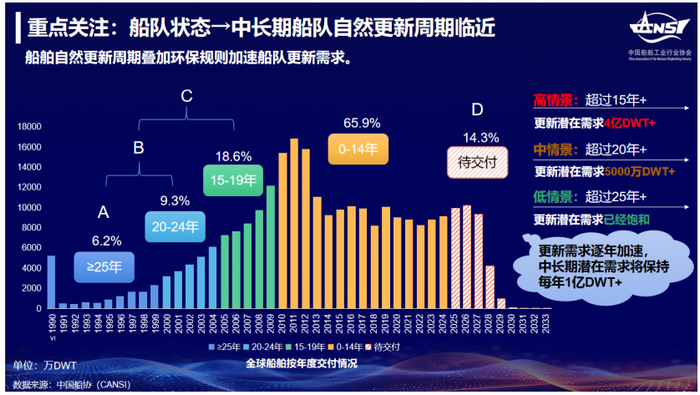 21世纪初的上一轮造船超级周期不仅创造了新接订单量的历史极值,还带来了大规模船舶的交付。叠加减排规则,这些船舶的技术和经济寿命正在接近或已经达到临界点。截至2024年末,超过25年的船舶占全球船队(含在建)的份额6.2%,20—24年的船舶占9.3%,15—19年的船舶占18.6%,三者份额合计超过三成,约合运力5亿DWT的潜在更新需求。随着航运市场回归常态,运费价格回调后,考虑不同情景下的更新条件,老旧船舶的拆解将逐步放量,更新需求将逐年加速,中长期将创造年均1亿DWT的新船需求。