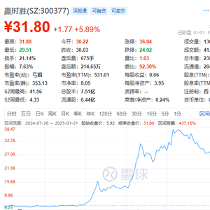1月21日收盘,赢时胜(300377)股价涨5.89%,收报31.80元/股,目前公司总市值238.8亿元。近6个月来,该股股价大涨,累计涨超437%。
