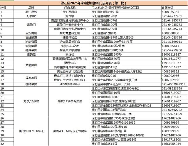 徐汇区2025年家电以旧换新门店列表(第一批)如下