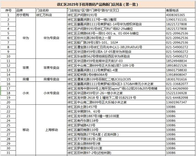 徐汇区2025年手机等数码产品购新门店列表(第一批)如下