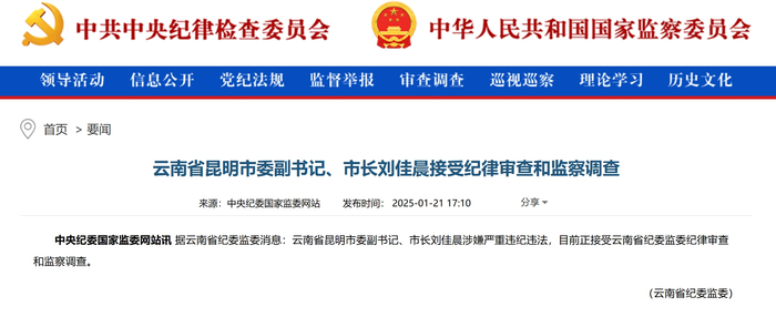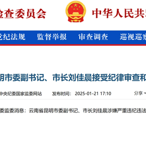 中央纪委国家监委网站1月21日发布,据云南省纪委监委消息:云南省昆明市委副书记、市长刘佳晨涉嫌严重违纪违法,目前正接受云南省纪委监委纪律审查和监察调查。