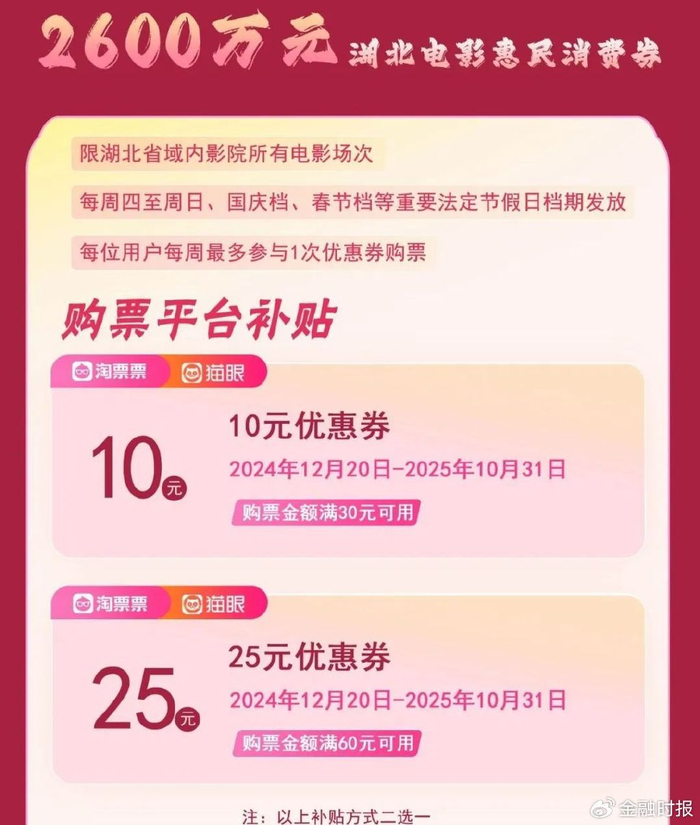 2025年10月31日前,每周四至周日、国庆档、春节档等重要节假日档期,用户可关注武汉生活之窗微信公众号,在聊天对话框发送“消费券”获取湖北电影惠民消费券领券入口&领用攻略、活动细则,查看最新武汉消费券汇总。