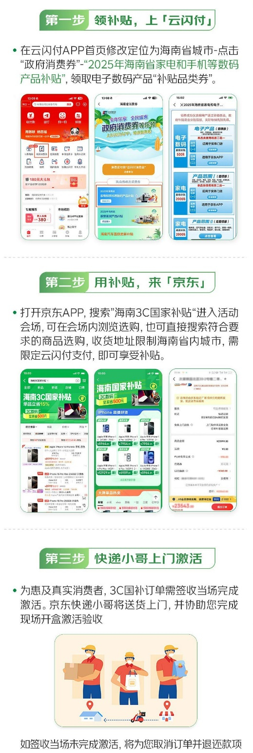 根据领取补贴,海南省消费者需打开云闪付APP,在首页选择“政府消费券”,进入海南省消费券领取页面后,选择“2025年家电和手机等数码产品补贴”,领取电子数码产品“补贴品类券”,注意需要领取适用于京东APP场景使用的消费券。领取相应资格后打开京东APP,搜索“海南3C国家补贴”进入活动会场,可在会场内浏览选购,也可直接搜索符合要求的商品选购,收货地址限制海南省内城市,在支付时选择云闪付支付,即可享受补贴。