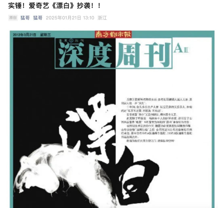 该文章作者称,“爱奇艺的《漂白》创作团队事先没有联系我或南方都市报,在宣发材料中,也没有标示原作出处。”