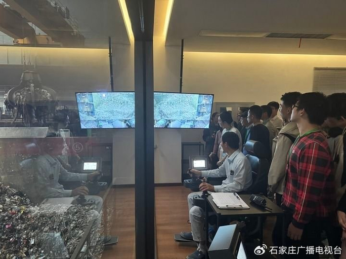 2024年10月12日,在河北雄安光大生态产业园,师生们观看工作人员操作智能垃圾吊将生活垃圾运往焚烧炉。新华社记者 王美祺 摄