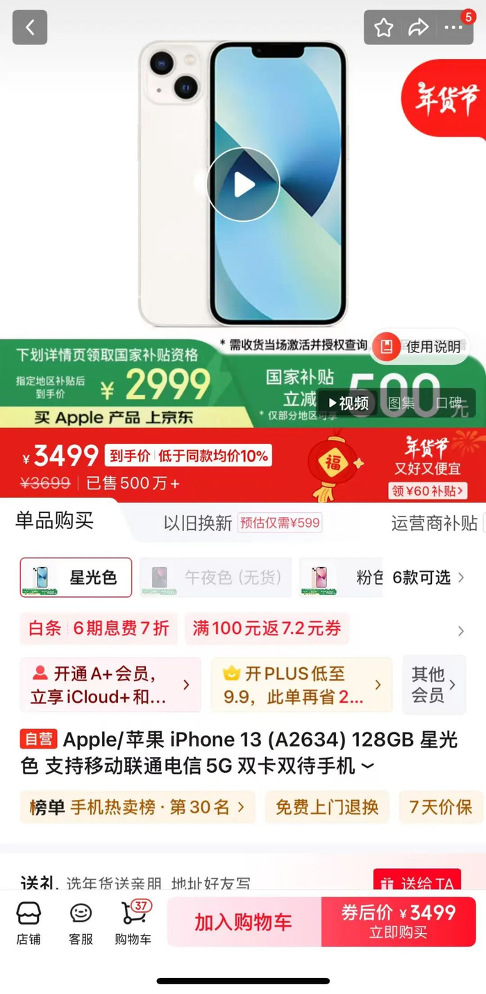 据悉,有网友发现国补后iPhone13 128G版本到手价格跌破3000元,降到历史低价。记者在京东平台上看到,iPhone13销售页面显示,指定地区补贴后到手价2999元。