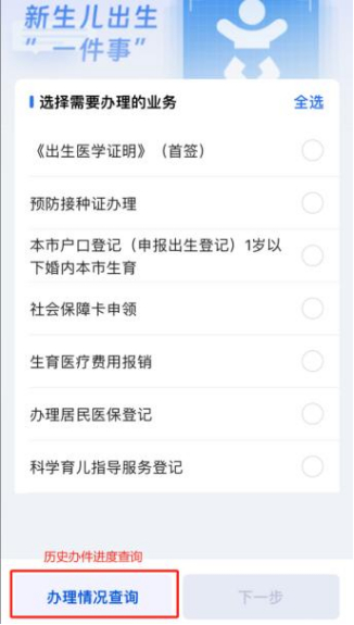 再次进入新生儿出生“一件事”在线办理中的联办事项选择界面可查看办理进度。