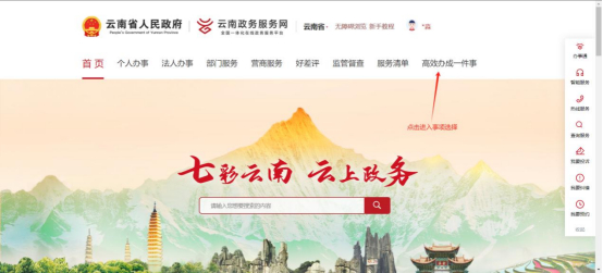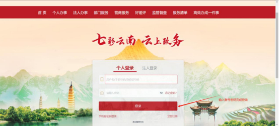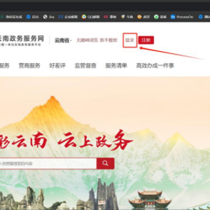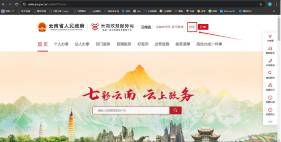 浏览器地址栏输入https://zwfw.yn.gov.cn/进入云南政务服务网,注册并点击“登录”。