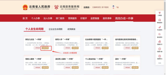 云南省新生儿出生“一件事”需由申请人(新生儿母亲)登录云南省政务服务网(https://zwfw.yn.gov.cn/) 或移动端下载APP“一部手机办事通”进行办理。