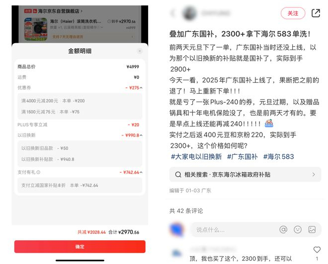 其中广东国家补贴帮他省了 742 元,以旧换新旧家电省了 990 多,京东优惠券还减了 275 元。