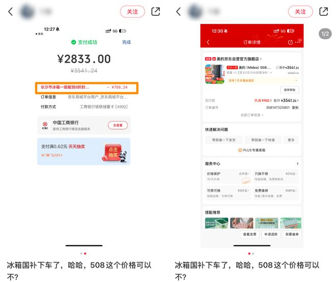 也有长沙网友成功下车,用 2800 的价格买到了原价 3500 的美的法式多门冰箱,其中国补硬生生省下了 700 元。