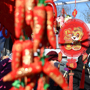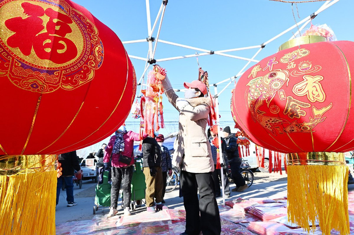 春联、福字、灯笼,年前的集市上这些都是必不可少的节庆用品。家住附近小区的刘玉清刚买了两个大红灯笼,看着成串的小辣椒喜庆又可爱,忍不住又买了两串,“小蛇的福字也好看,您再给我拿六张,春联也要两副……”一通“买买买”之后,刘玉清高兴地说:“福字、窗花、春联,再挂上大灯笼和小辣椒,家里年味儿一下就来了。”