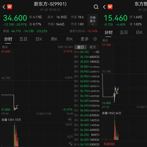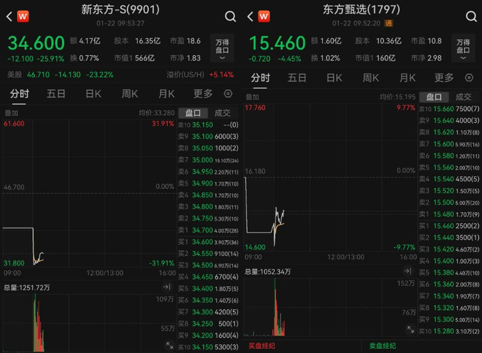1月22日港股开盘,新东方-S(9901.HK)、东方甄选(1797.HK)股价双双大跌。截至9:53,港股新东方盘底一度跌超31%,东方甄选一度跌近10%。