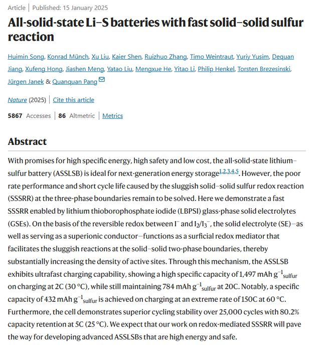 北大2025首篇Nature:新型固态锂硫电池问世,循环寿命超25000次