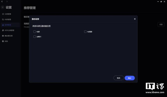 除了这些,极影视 2.0 在一些深度功能使用体验上也做了升级,比如在分类管理方面,全新的推荐管理功能可以帮你更加自由且便捷地管理您的影视库,在推荐管理的设置中,勾选不想被推荐的分类,点击“确定”之后,首页的影视推荐板块中就不会推荐出你不想展示的影视资源了。这个功能真的是太懂用户了~