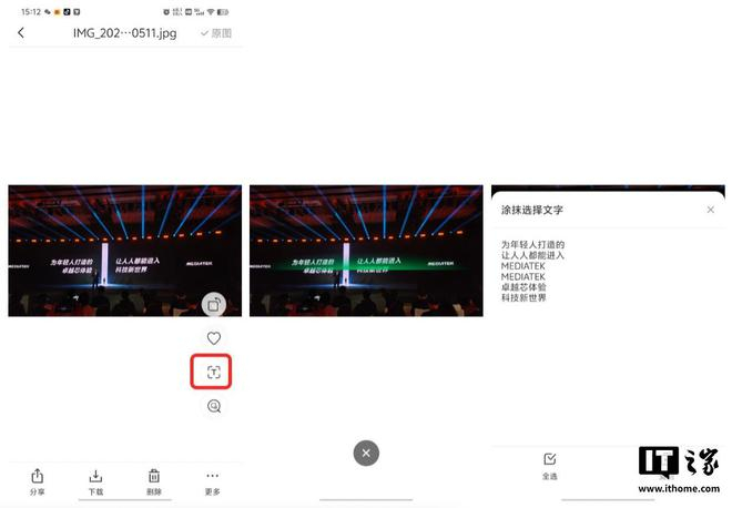 比如当小编在写稿时,需要复制这张发布会 PPT 照片中的文字,就只需要点击右下角的“文字识别”按钮即可,识别完成后,照片中的文字就会出现在文本框中,可以选取需要的部分,也可以一键全部复制,很方便。