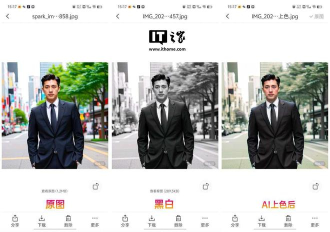 小编先尝试了“黑白照片上色”的功能,先把一张成年男人的照片调成黑白色,让 AI 去上色,再将上色后的照片和原片对比,可以看到上色的效果还是比较自然、准确的,就是整体饱和度没有原来那么高,嘴唇部位的上色略有瑕疵。