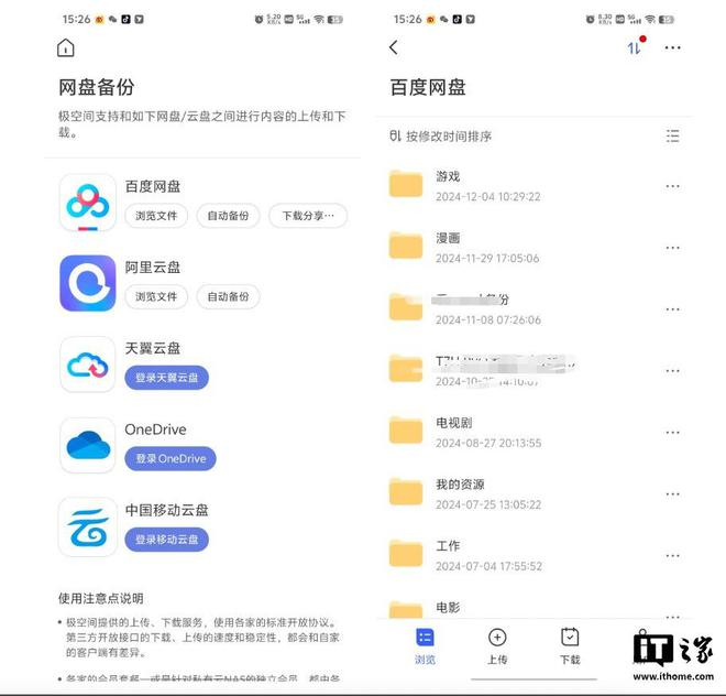对于极空间 Q4 来说,将影视内容资源导入的方式有很多,你可以上传、提前拷贝到硬盘中,或者通过内置的迅雷下载工具进行下载。不过小编更喜欢的是“网盘备份”的功能,这里提供了百度网盘、天翼云盘、OneDrive 、阿里云盘、中国移动云盘的备份功能,以百度网盘为例,绑定你的账号后,就可以将你百度网盘里的文件下载到极空间 Q4 中,或者将极空间中的文件上传到百度网盘里。