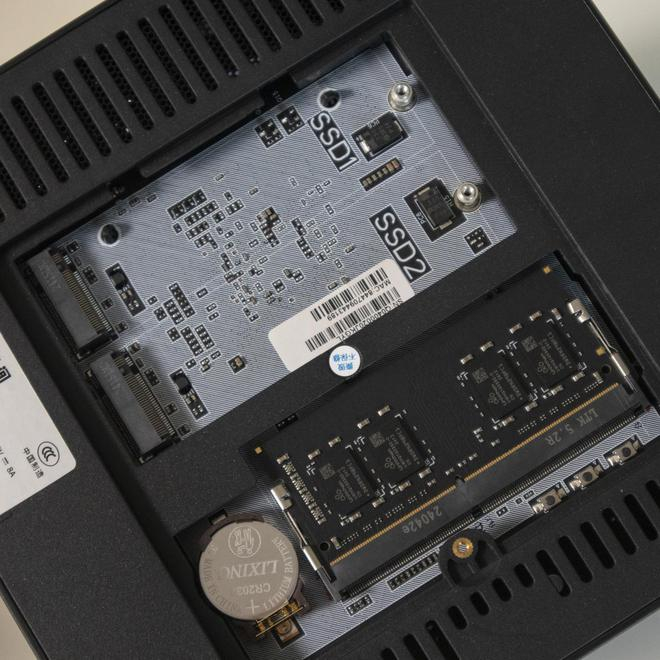 机身背面则为竖向排列的散热格栅,下方还有下沉式的接口集群,这款产品提供了 1 个 HDMI 2.0b 接口,支持 4K@60hz,1 个 2.5GbE 闪速网口,1 个 USB 3.2 Gen2 接口、1 个 USB 3.2 Gen2 Type-C 接口、以及电源接口。