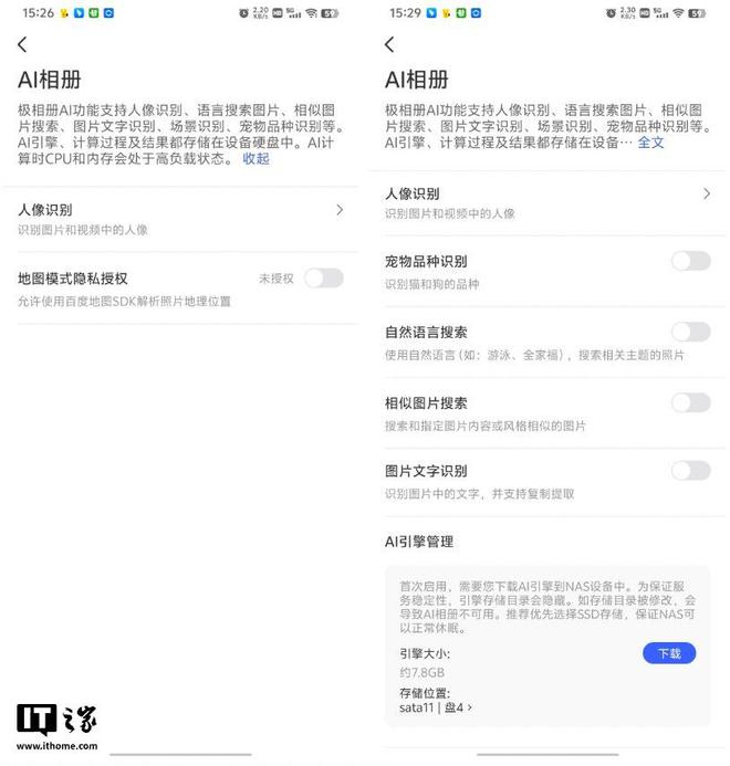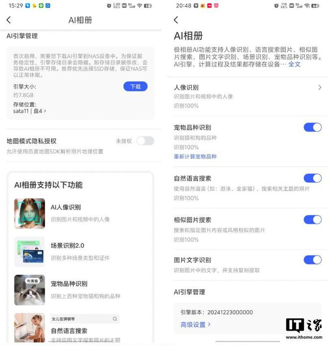 而有了极空间 Q4 的 AI 能力,如今这些问题就迎刃而解了。具体来说,大家可以在极空间 App 中的极相册应用设置里,打开所有和 AI 相关的选项。不过这里需要提醒的是,由于极空间的 AI 能力是部署在本地的,因此在使用相关功能时,可能会占用较高的 CPU 和内存负载,不过正因如此也说明极空间的 AI 功能是安全的,不用担心隐私被上传。