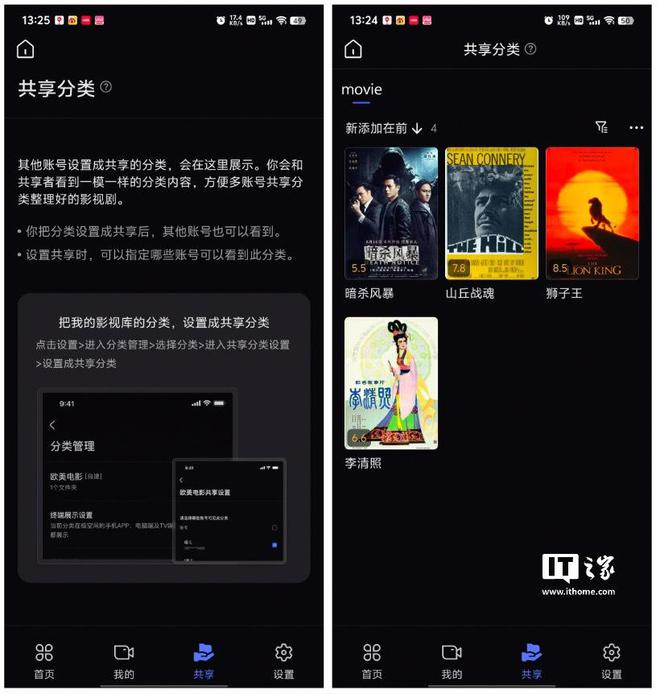 不仅如此,极影视还支持和其他账号分享。其他账号设置成共享的分类,会在“共享”栏目中展示,你会和共享者看到一模一样的分类内容,方便多账号共享分类整理好的影视剧,相当于是多个成员一起共建家庭影视库,这也是一个很实用的功能。