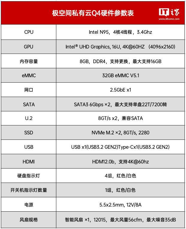 硬件方面,首先IT之家拿到的这款极空间私有云 Q4 的具体参数信息如下: