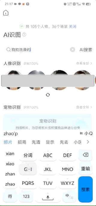比如小编在和朋友聊天时,想给对方看我家狗狗洗澡的照片,就可以直接搜索“狗狗洗澡的照片”。注意,这不是关键词搜索,而是自然语言,有多个限定条件,可以看到 AI 能够很快地帮我找到所有相关的照片,整个过程只要几秒。