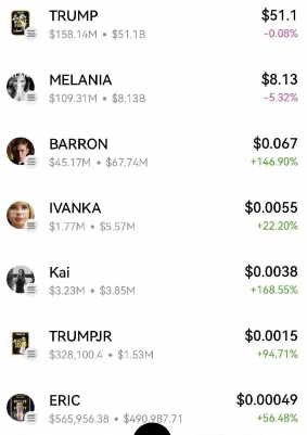 更荒诞的是,在特朗普之后,特朗普家族几乎“全员上阵”:妻子梅拉尼娅、大女儿伊万卡、小儿子巴伦、甚至连所谓的“官方保洁员”,加密市场上都有了挂这些人头像的专属模因币在交易。这简直令一向疯狂的加密业内都看得头晕目眩。