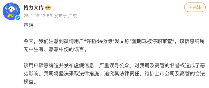 据南财快讯·辟谣旋风队此前报道,1月18日,“格力文传”微博发布声明称,注意到微博用户“许韬de微博”发文称“董明珠被停职审查”。该信息纯属无中生有、恶意中伤的谣言。