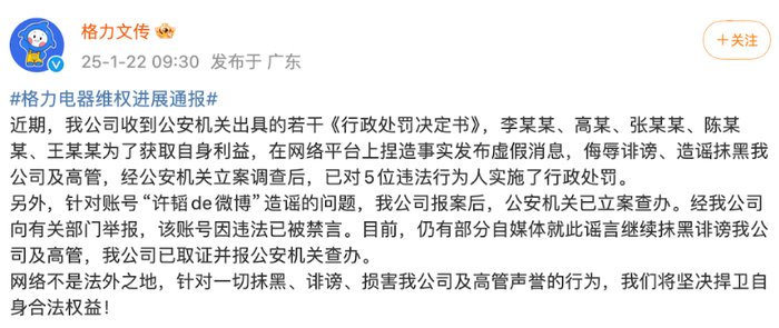 南财快讯记者注意到,1月22日上午,珠海格力电器股份有限公司文化传媒中心认证账号“格力文传”微博发布“格力电器维权进展通报”。
