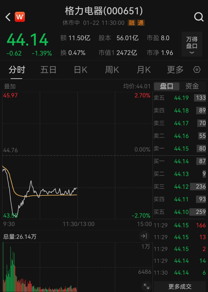 截至22日午间收盘,格力电器跌1.39%,报44.14元/股。