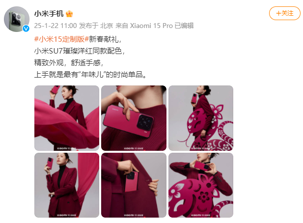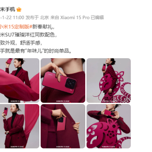 据介绍,小米15定制版新春献礼是小米SU7璀璨洋红同款配色,包装盒采用全新设计,左下方印有“璀璨新年”字样,年味拉满。
