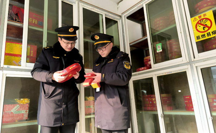 1月21日,龙潭镇市场监管所执法人员在一家烟花爆竹零售单位检查烟花爆竹质量。