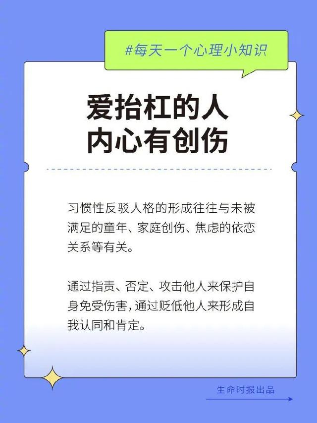 据@生命时报报道,实际上,习惯性反驳人格的形成,往往与未被满足的童年、家庭创伤、焦虑的依恋关系等有关。童年时期被压抑的内心冲突,转化成了人格防御——“先下手为强”来保护自己。