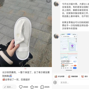 24年某一天,长沙突降大雨,有位网友在上班路上全身淋湿,在路边紧急找了一家五星级酒店借拖鞋,未果。继而又去了对面的全季,前台二话不说给她拿出了一双一次性拖鞋。回去之后,她特地留言,建议全季“推出扫码或者免费给予一次性拖鞋的服务”。