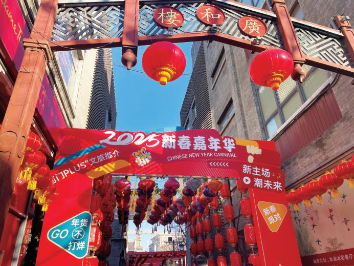 在北京前门大街,一家家老字号门店总是人们购置年货的首选之地。1月18日,距离2025乙巳蛇年春节还有十余天,前门大街上已经高高挂起大红灯笼,喜气洋洋,前来采买年货的市民络绎不绝。