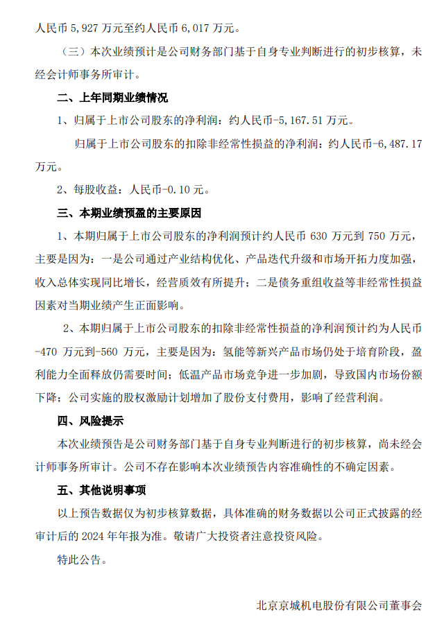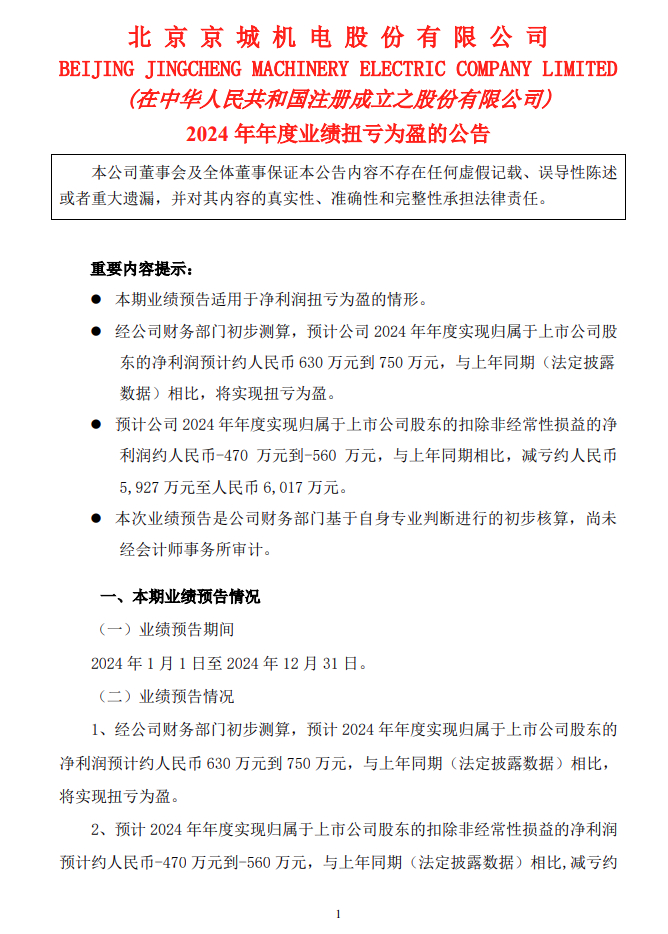 1月21日, 京城股份 公布,预计公司2024年年度实现归属于上市公司股东的净利润为约人民币 630万元到人民币750万元,同比将实现扭亏为盈。预计公司2024年年度实现归属于上市公司股东的扣除非经常性损益的净利润为亏损约470万元到人民币560万元。