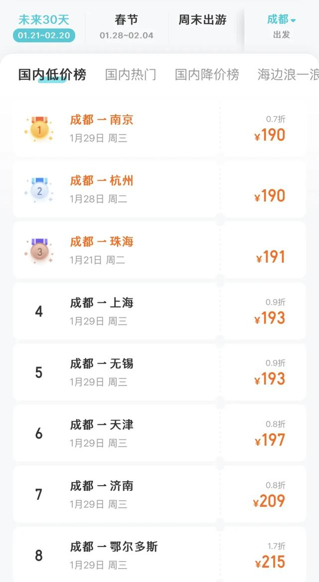 以成都出发的机票为例,春节假期期间,成都到上海降价78%、到南京降价75%,到杭州降价74%。
