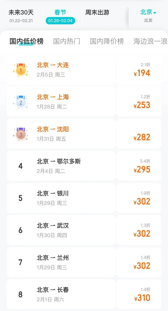 北京方面,春节假期期间,北京到海口机票降价62%,到上海降价59%。
