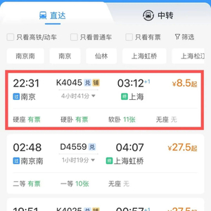 铁路12306显示,南京到上海的K4045次,硬座票价8.5元,相当于1.9折。不过,这趟车行程时间4小时41分钟,让网友忍不住吐槽“没有性价比”。记者注意到,这趟车不是每天都有,年前从1月22日至1月26日有。同样是这趟K4045次列车,徐州到南京的硬座票价是9.5元,行程时间5小时44分钟。
