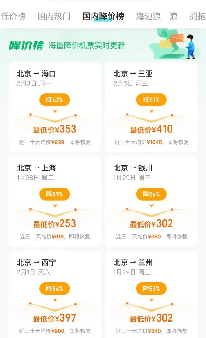 北京方面,春节假期期间,北京到海口机票降价62%,到上海降价59%。