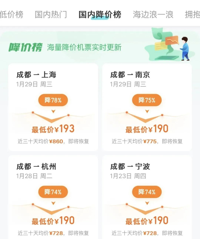 以成都出发的机票为例,春节假期期间,成都到上海降价78%,到南京降价75%,到杭州降价74%。