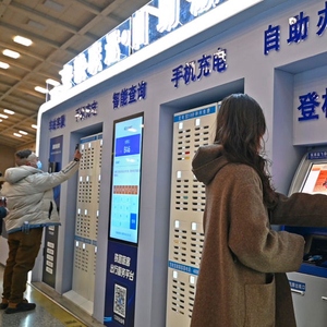 图为旅客在汉口站候车室打印登机牌。 (国铁武汉局供图)