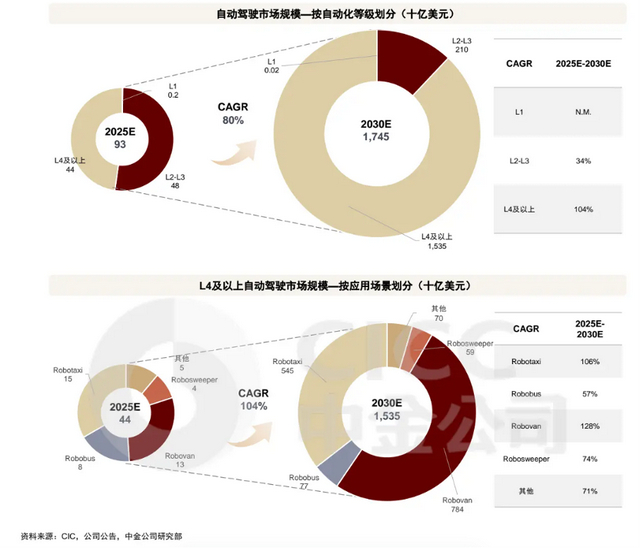 根据 CIC 的预测,全球自动驾驶市场规模预计将从 2025 年的 930 亿美元增长到2030 年的 1.7 万亿美元,对应 2025 年至 2030 年复合增速为 80%;其中,L4 及以上等级自动驾驶的市场增速预计将明显高于行业平均水平,市场规模预计从 2025 年的 440 亿美元增长到 2030 年的 1.5 万亿美元,复合增速达 104%。