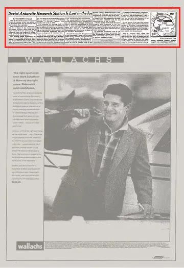 人们议论纷纷,揣测神秘油桶的来源。一个敏锐的队员查到了《纽约时报》网站上一篇1986年10月5日的报道《苏联南极科考站消失在了冰中》,报道讲述了南极海岸菲尔希纳-龙尼冰架(Filchner-Ronne Ice Shelf)冰架崩裂,一块巨大的冰山(即A23a冰山)分离了出去,原本位于冰架上的前苏联科考站德鲁日纳亚1号站(Druzhnaya 1)消失。1987年又有一篇报道称,前苏联派船和直升机登陆冰山找到了该科考站,抢救出一些重要物资。此后,由于种种原因,它又被遗落在冰山中,30多年来未曾现世。