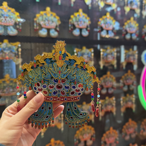 明十三陵博物馆主题文创·朕的宝贝主理人胡永和介绍,区别于国博的文创产品,本次亮相线下的两款冰箱贴,是十二龙九凤冠和六龙三凤冠的衍生产品,而十二龙九凤冠是四顶凤冠中规格最高的一顶。他讲述,冰箱贴均为木质拼接而成,在做这两款冰箱贴的时候,特意采用了自研的铝箔凹凸工艺,能让凤冠更有立体感,更好地还原凤冠的华丽和精彩的叠翠工艺,将凤冠熠熠生辉的感觉完美复刻出来。