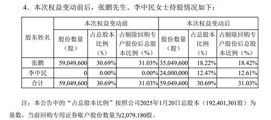 根据张鹏与李中民签订的《离婚协议》,张鹏拟将其持有金丹科技的2400万股股份,约占金丹科技总股本的12.47%(占剔除回购专户股份后总股本比例12.61%),分割至李中民女士名下。