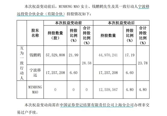 本次权益变动之前,钱鹏鹤及其一致行动人宁波移远投资合伙企业(有限合伙)(以下简称宁波移远)合计持有移远通信7479万股股份,合计持股比例为28.58%。其中,钱鹏鹤持有移远通信约5753万股,持股比例为21.99%;宁波移远持有移远通信股份约1726万股,持股比例为6.60%。