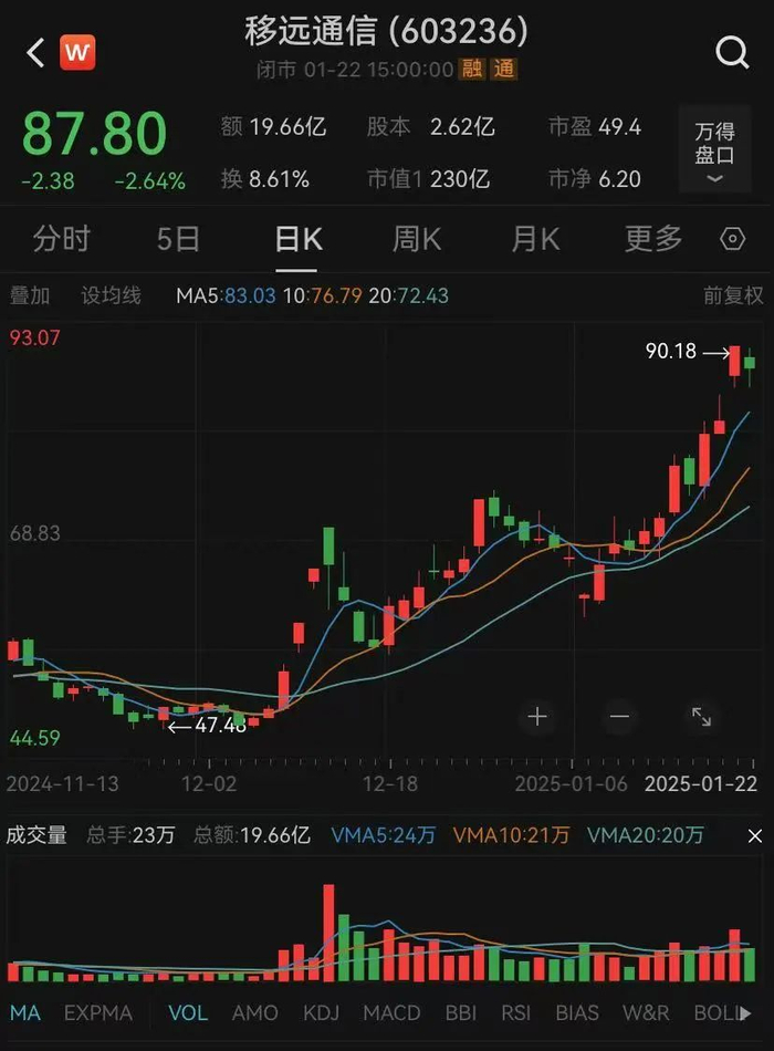 《每日经济新闻》记者注意到,从2024年开始,移远通信的股价快速上涨,从最低29.78元/股上涨最高至90.18元/股,涨幅超200%,总市值接近230亿元,成为资本市场关注的“黑马”。2024年11月底至今,移远通信股价上涨接近80%。